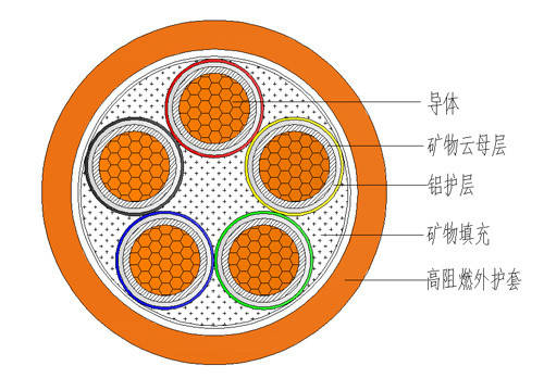 绝 缘:纯金云母带(不再与挤包绝缘料复合组成,从而排除碳粒的产生,提高了耐电稳定性)。